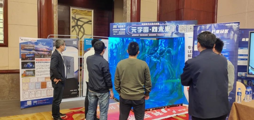 江蘇亮彩展出了3D LED“元宇宙劇場”場景應用方案,由GF箱體搭建而成三面的大屏。通過覆蓋全視角,打造虛擬氛圍,達到沉浸式體驗效果,讓現場嘉賓流連忘返。